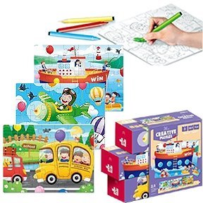 Each box contains a 24 pc, 30 pc & 35 pc jigsaw puzzle for kids. Printed box.