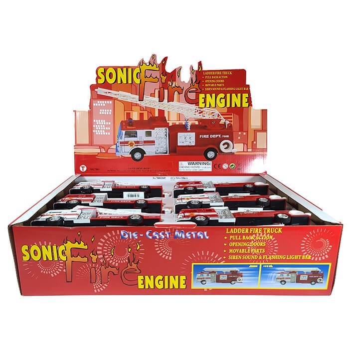 Die cast fire engine with plastic parts. Extendable ladder. Light & sound. Battery included. Pull back and go action. 12 pcs/display box.