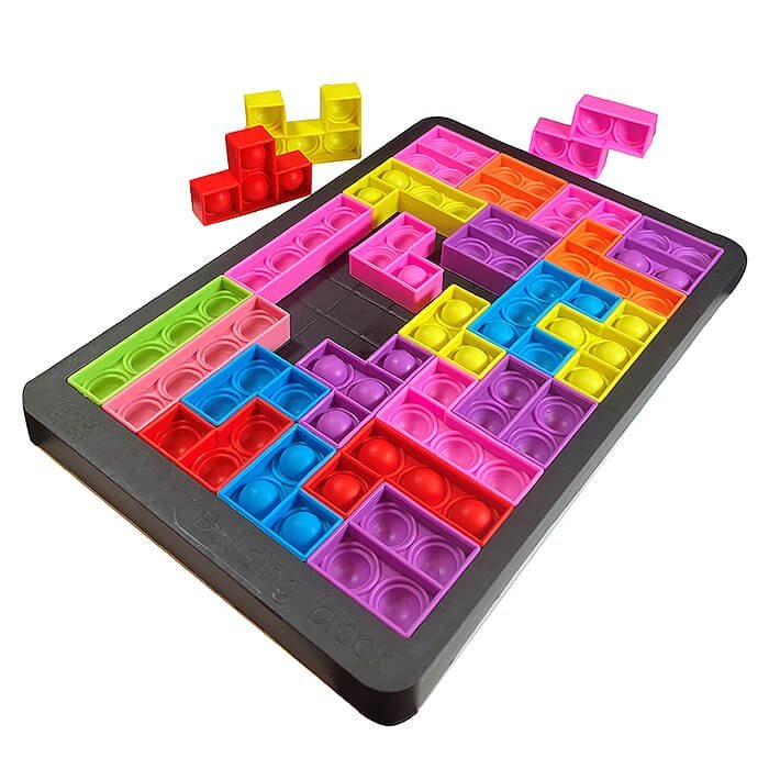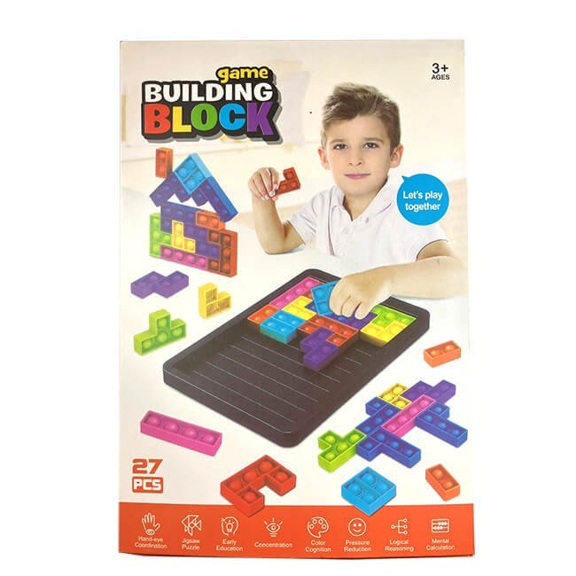 Classic tetris building block set now as a 27pc podget toy. Tetris with multiple geometric shapes, both colorful and engaging. Printed Box