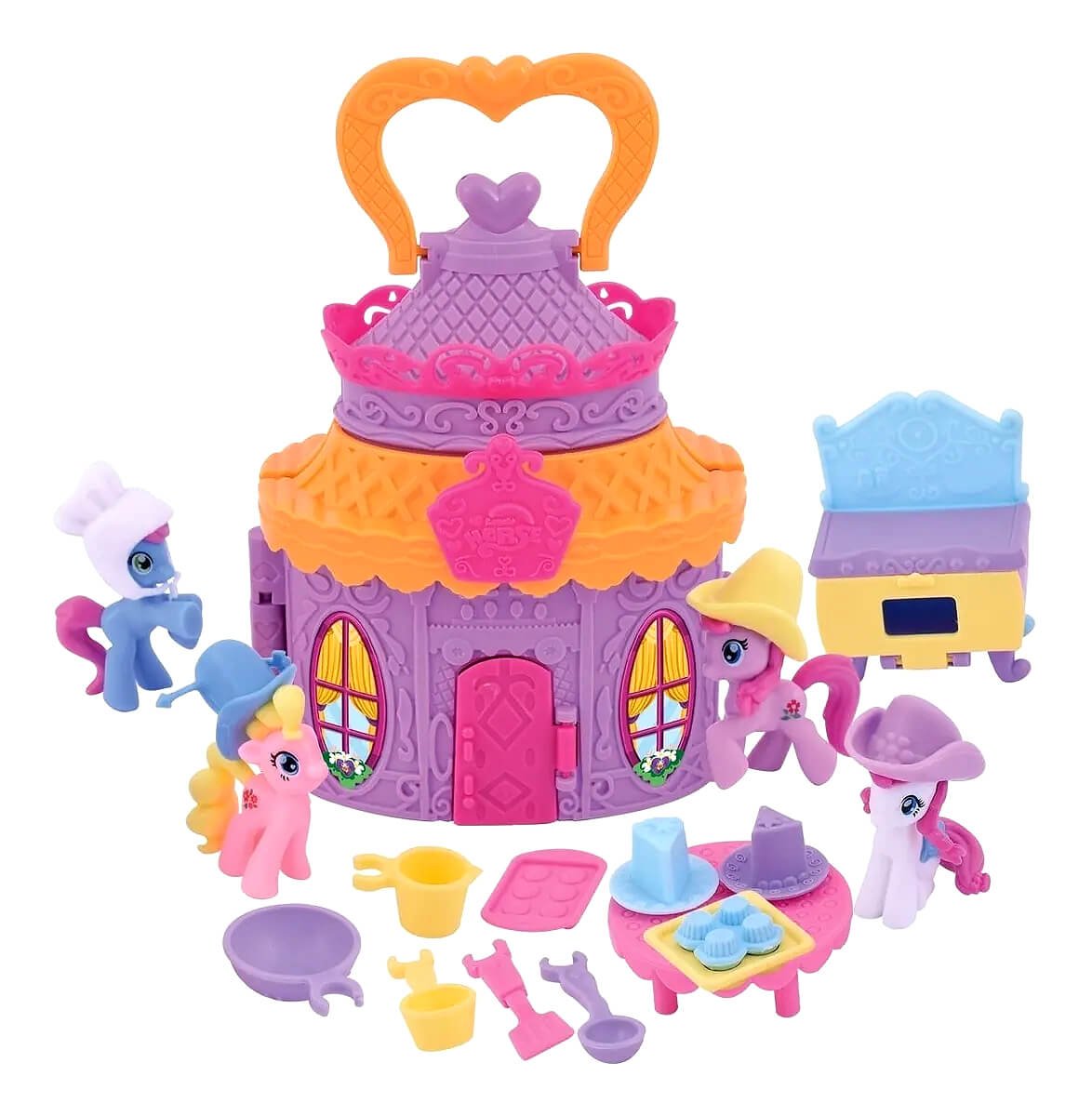 Set contains 4 2″ dressed up pony figurines & a pony castle with accessories. Window box.
