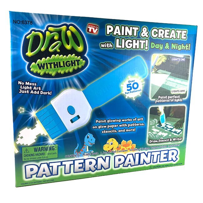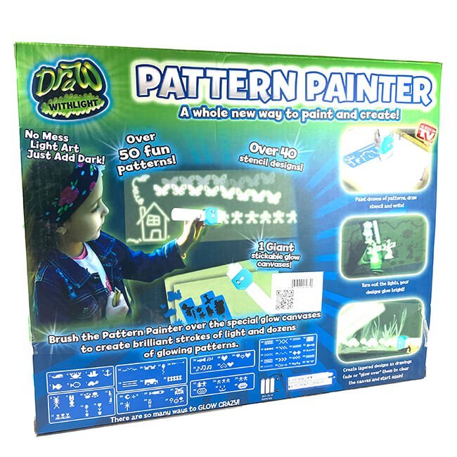Brush the pattern painter over the special glow canvases to create brilliant strokes of light & dozens of glowing patterns. Uses 3 AA batteries (not included). Printed box.