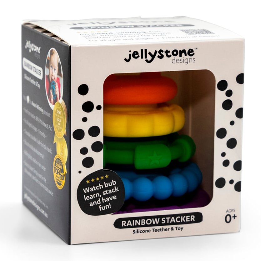 Safe, colorful, and fun! This silicone rainbow stacker doubles as a teether, helping babies soothe gums while promoting problem-solving, creativity, and hand-eye coordination. Suitable from birth.